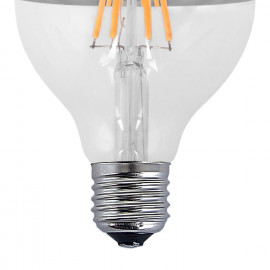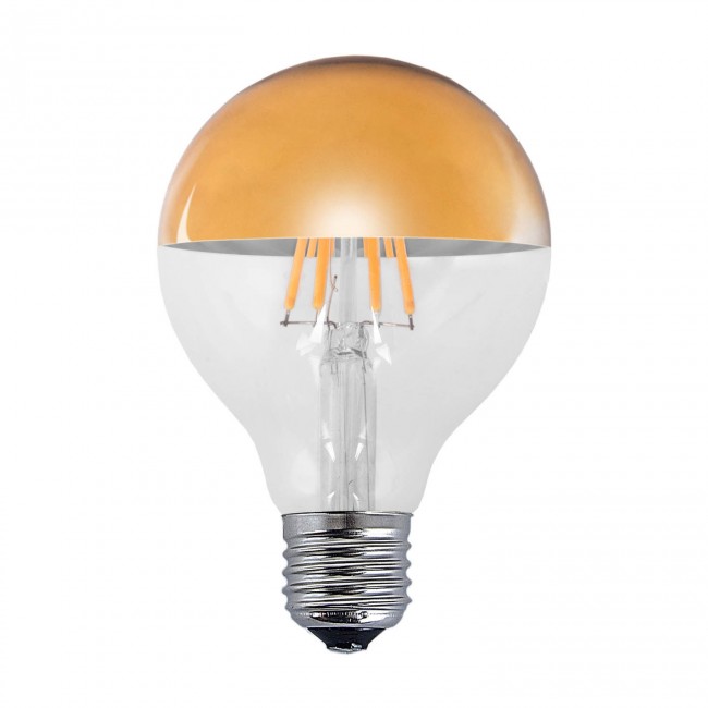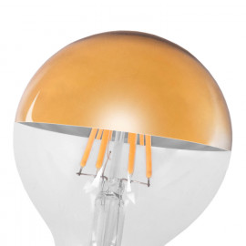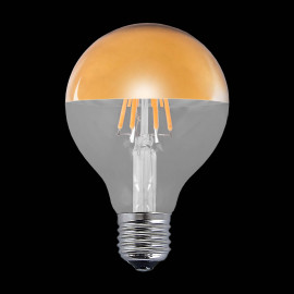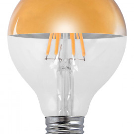 Su fuente lumínica está compuesta por LED de filamento de zafiro sintético y tiene una luminosidad de 267 lúmenes. Esta bombilla está fabricada en cristal transparente y dorado con un diámetro de 8 cm y una cubierta reflectora superior, dando un efecto muy especial a la luz que proyecta, ideal para aportar un ambiente cálida a tu casa.