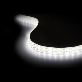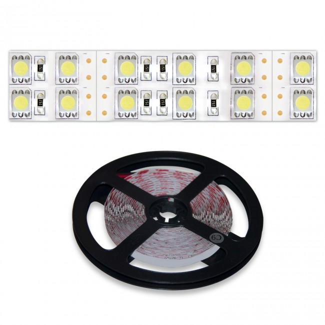 Tira LED 12V DC Luz Blanca 6500k 120LED/m. Esta tira LED monocolor tiene 5 metros de longitud. Utiliza LED de tecnología SMD5050 de gran luminosidad que emite aproximadamente 1920 lúmenes por metro en un ángulo de 120º. Se pueden realizar cortes, siempre y cuando, se respete la parte señalada en el recorrido de la tira señalado con el dibujo de unas tijeras.